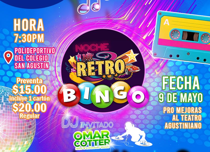 Actividad bailable en donde recordaremos los grandes éxitos de los 70, 80 y 90’s con juegos de bingo a beneficio del Teatro Agustiniano. Fecha y horario: sábado 9 de mayo de 7:30 pm a 12am